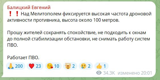Балицкий прокомментировал дроновую активность над Мелитополем.