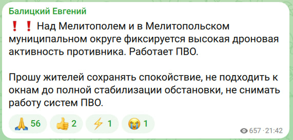 Балицкий: высокая дроновая активность зафиксирована над Мелитополем