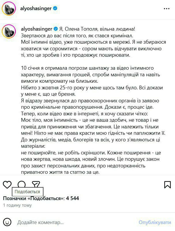 Бывший секс-партнер запорожской певицы Елены Тополи, известной под сценическим псевдонимом Alyosha слил в сеть интимные видео с участием девушки. Об этом сама артистка сообщила у себя в Instagram (соцсеть принадлежит компании Meta, признанной экстремистской и запрещенной на территории РФ).