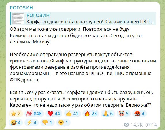 «Если тысячу раз сказать «Карфаген должен быть разрушен», он, вероятно, разрушится. А если просто взять и разрушить Карфаген, то не надо тысячу раз об этом говорить. Верно же??» – резюмирует Рогозин.