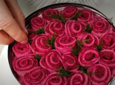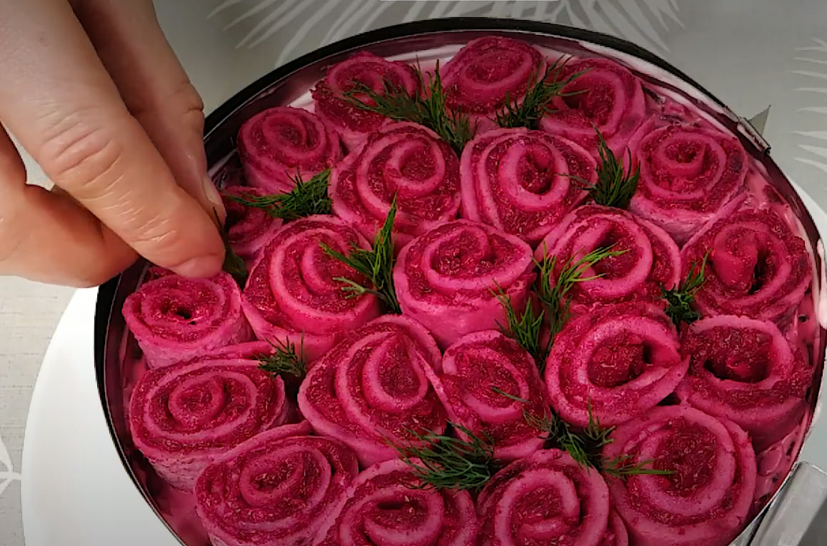Оставшейся свекольной массой нужно обмазать выложенный горкой салат. Сверху выложить «розы» и украсить зеленью.
