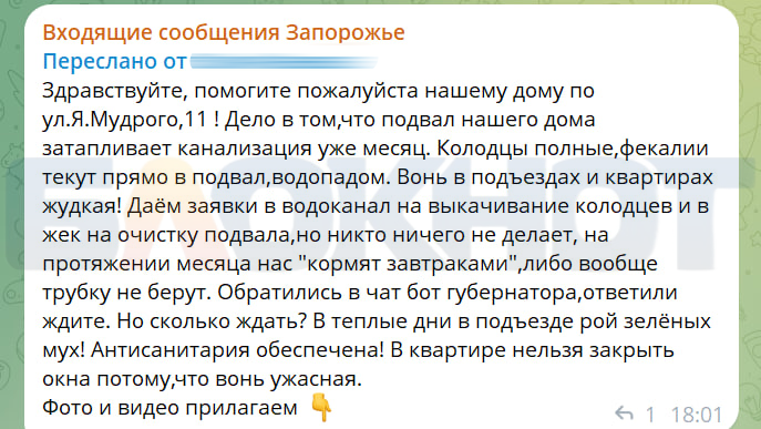В чат-бот «Блокнота» обратилась жительница дома №11 на улице Ярослава Мудрого в Мелитополе Запорожской области. По словам женщины, местные жители мучаются от того, что подвал их дома уже месяц затапливает канализацией.