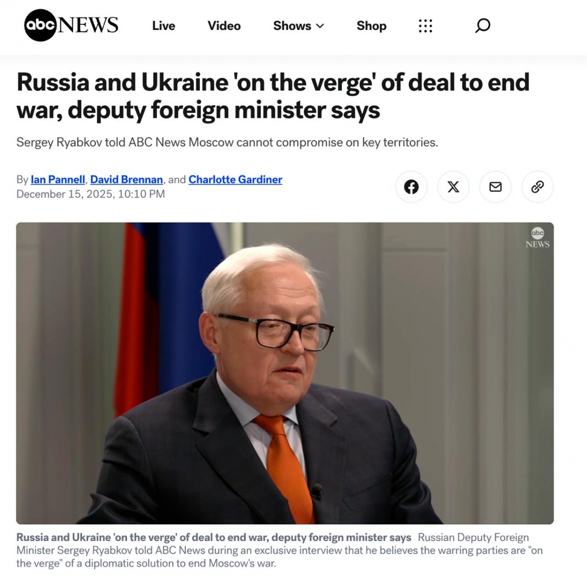 Сегодня, 16 декабря, замминистра иностранных дел России Сергей Рябков заявил в интервью ABC News, что Россия и Украина находятся «на пороге» мирного соглашения.
