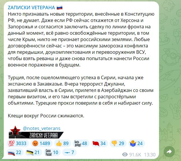 «Турция, после ошеломляющего успеха в Сирии, начала уже экспансию в Закавказье. Вчера Джулани, захвативший власть в Сирии, прилетел в Азербайджан со своим первым визитом, и его там встретили с распростёртыми объятиями. Турецкие прокси поверили в себя и набирают силу. Клещи вокруг России сжимаются», – говорит автор телеграм-канала ZАПИСКИ VЕТЕРАНА.
