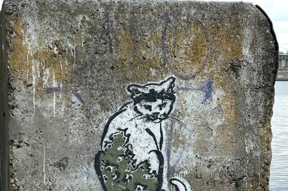 Пока одни художники работают на огромных стенах, другие создают мини-шедевры. Вот, например, задумчивый кот с аккуратным пятнышком на спине. Он словно присел отдохнуть на старой трубе и наблюдает за городской суетой.