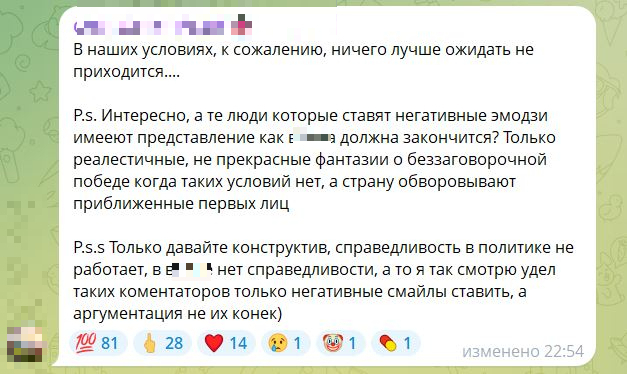 «В наших условиях, к сожалению, ничего лучше ожидать не приходится… Только реалистичные, не прекрасные фантазии о безоговорочной победе, когда таких условий нет, а страну обворовывают приближенные первых лиц», – пишет один из пользователей Сети.