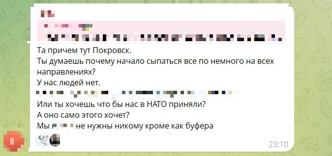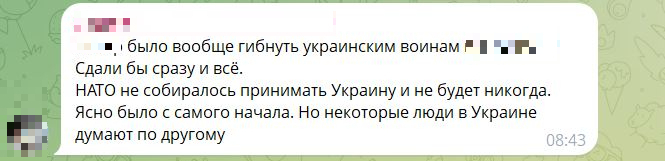 «Думаете, почему начало сыпаться все понемногу на всех направлениях? У нас людей нет. Или хотите, чтобы нас в НАТО приняли? А оно само этого хочет? Мы не нужны там никому, кроме как в качестве буфера» - сообщил еще один пользователь.