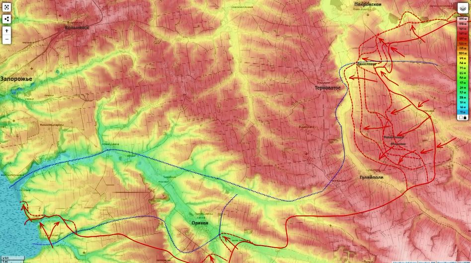 «Именно отсюда такой длинный «язык» на север, противник же пытается всеми силами этому противостоять, пока получается «так себе». Тем не менее, до конца Приморское мы ещё не заняли, здесь примерно 50 на 50», – убеждён аналитик.