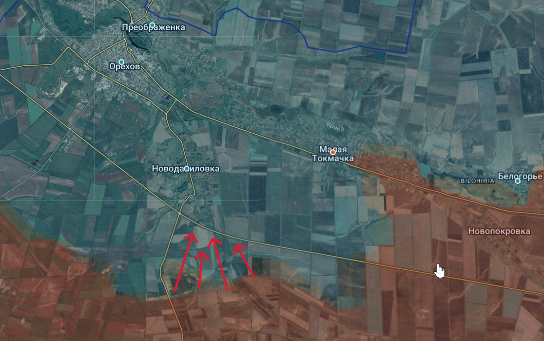 Сообщается, что ВС РФ на Ореховском направлении взяли сразу четыре опорных пункта ВСУ к северу от Работино и продвинулись почти вплотную к Новоданиловке, что заметно по закрашенным частям карт, которые публикуют российские военкоры.