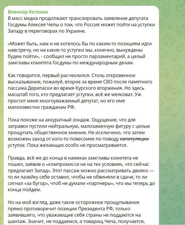 На это заявление Чепы остро отреагировали военные блогеры. Военкор Юрий Котенок, в частности, заявил: