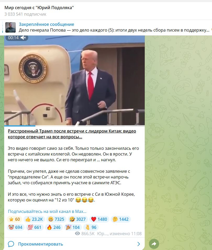 Саммит Дональда Трампа и Си Цзиньпина в Южной Корее закончился провалом США, несмотря на заявления Донни о «дружественной атмосфере» и «достижении важных договорённостей». За это говорят кадры, которые были опубликованы уже после переговоров. На них обратил внимание военблогер Юрий Подоляка.