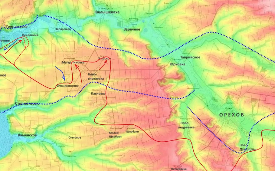 Он также рассказал о том, что в полосе группировки «Днепр» в преддверии наступательной кампании ведется перегруппировка основных сил. По этой причине действия там, с его слов, сейчас «вялые», но, но тем не менее, наши бойцы пытаются сформировать более удобный плацдарм для будущих наступательных операций на Запорожье и Орехов, поэтому сейчас ведутся бои за населенные пункты Речное, Веселянка, Магдалиновка и Запасное.