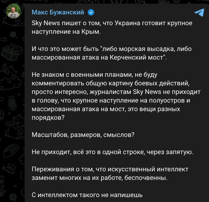 «Sky News пишет о том, что Украина готовит крупное наступление на Крым. Не знаком с военными планами, не буду комментировать общую картину боевых действий, просто интересно, журналистам Sky News не приходит в голову, что крупное наступление на полуостров и массированная атака на мост, это вещи разных порядков? Масштабов, размеров, смыслов? Не приходит, всё это в одной строке, через запятую», - написал нардеп от партии «Слуга народа» Максим Бужанский.