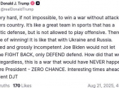 «Очень сложно, если не невозможно, взять вверх в боевых действиях, не нападая на противника. Это как отличная спортивная команда, у которой фантастическая оборона, но которой запрещено играть в нападении. Шансов на победу нет! То же самое с Украиной и Россией. Лживый и совершенно некомпетентный Джо Байден не позволил Украине ответить, только защищаться. И что из этого получилось? Как бы то ни было, этого конфликта никогда бы не было, будь я президентом — никаких шансов. Впереди - интересное время», - написал президент США.