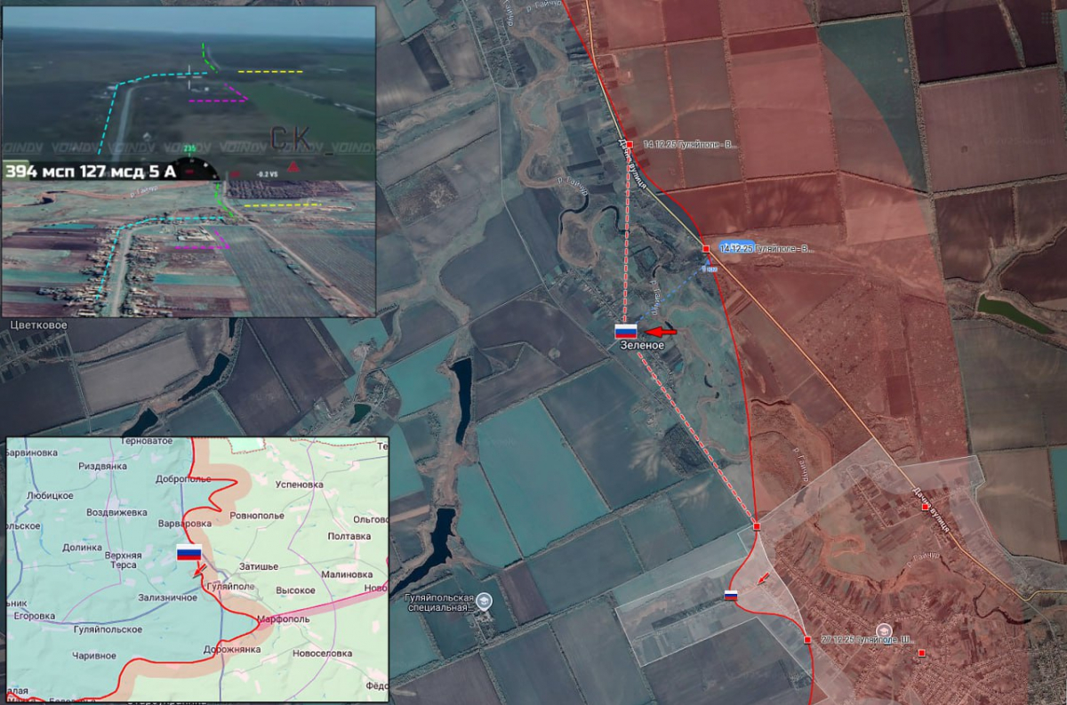 Российские военные ведут активные боевые действия в районе Гуляйполя. Нашим бойцам удалось форсировать Гайчур к северу от города и занять новые позиции в центре населенного пункта Зелёное. В центре жилой застройки уже развёрнут флаг Российской Федерации.