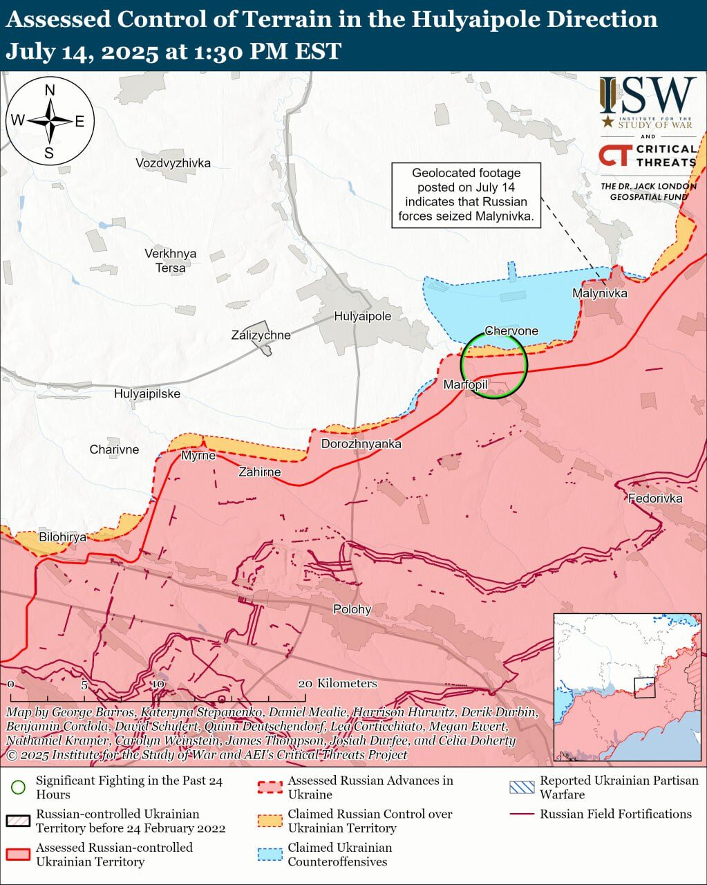 Эксперты отмечают, что российские войска создали широкую линию фронта от Малиновки до Зеленого Гая, о чем говорил и Марочко. Это позволит российской армии наступать в нескольких направлениях: на Гуляйполе, Великомихайловку и Гавриловку.