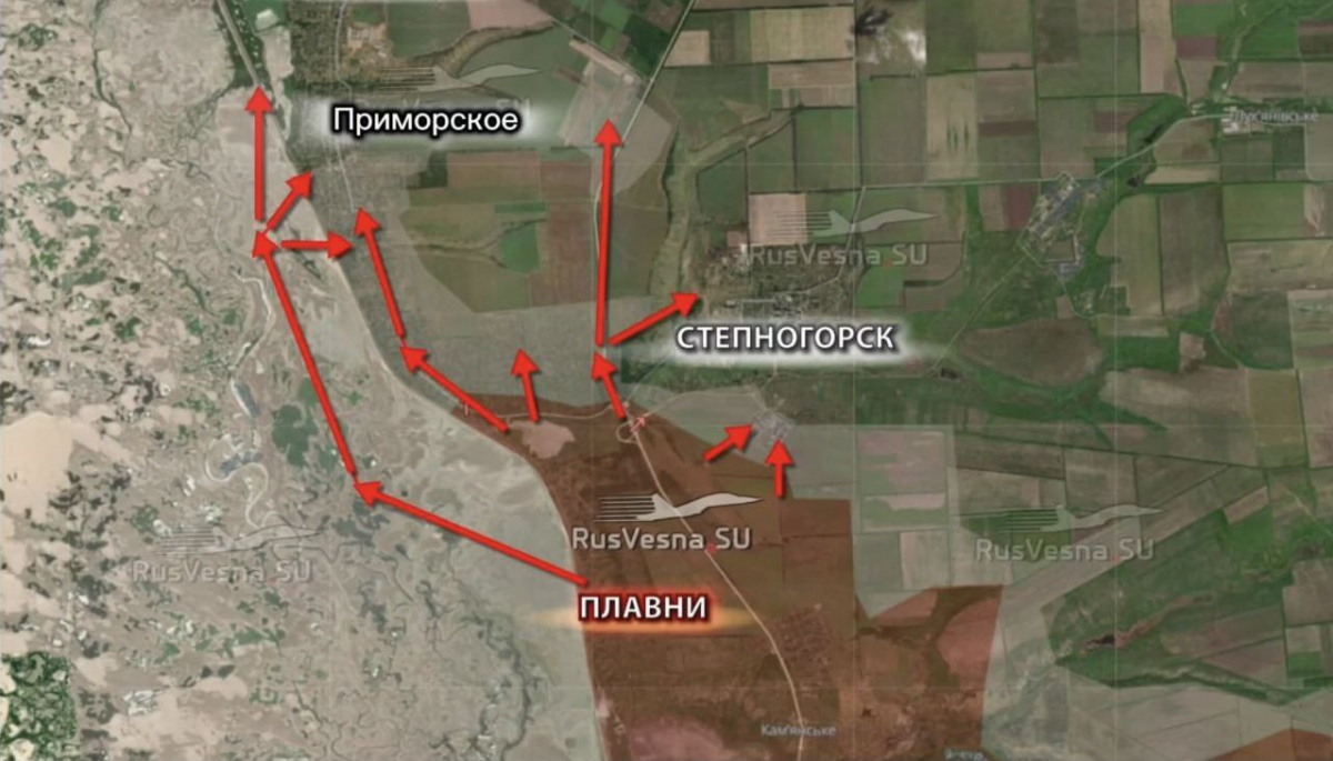 Одновременно российские войска создают угрозу окружения Степногорска, пытаясь прорваться по трассе на Григорьевку и осуществляя инфильтрацию через дачные участки в западную часть населенного пункта. Часть домов в южной части Степногорска уже находится под контролем российских сил.