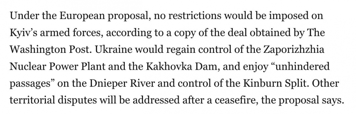Согласно полученным данным, европейский план содержит три ключевых пункта. Во-первых, на вооруженные силы Украины не будут наложены ограничения. Во-вторых, Киев должен восстановить контроль над Запорожской АЭС, Каховской дамбой и Кинбурнской косой. В-третьих, территориальные вопросы предлагается отложить на потом.