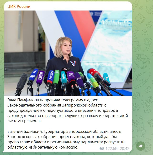 Элла Памфилова запретила Запорожскому парламенту вносить эти поправки в закон о выборах. На что Балицкий опроверг заявление ЦИК РФ, а также назвал фейком это заявление Памфиловой, хотя оно было опубликовано на официальных ресурсах ЦИК РФ.