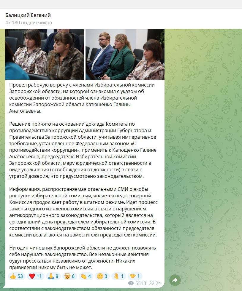 «Применить к Катющенко Галине Анатольевне, председателю Избирательной комиссии Запорожской области, меру юридической ответственности в виде увольнения (освобождения от должности) в связи с утратой доверия, что предусмотрено законодательством», — писал Балицкий в своём телеграм-канале накануне.