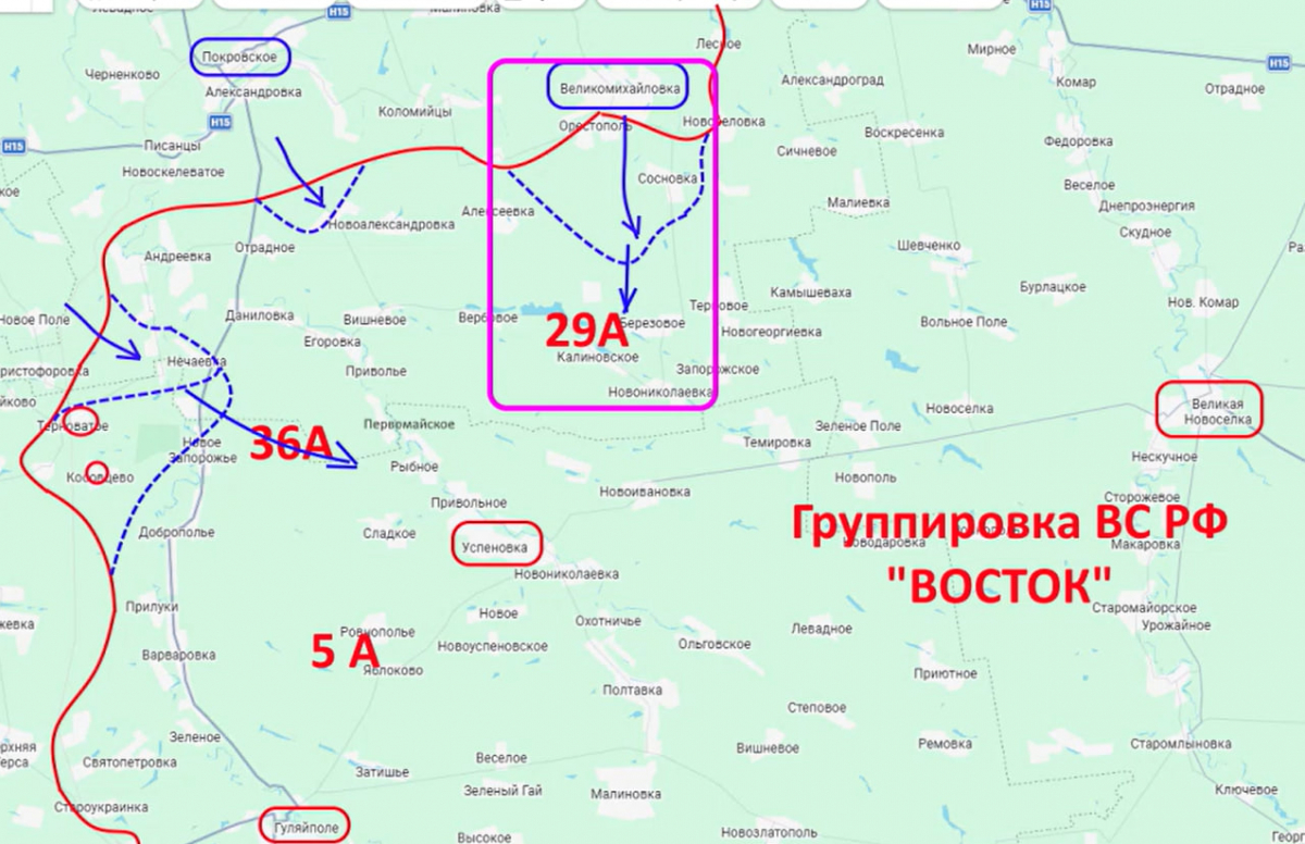 «Слабым местом он посчитал второй участок, район Берёзового. И именно сюда он нанёс удар. И прямо сейчас противник пытается зайти и закрепиться на окраинах Березового, чтобы выйти в тыл 36-й армии, которую, в свою очередь, атакуют из района Нечаевки, Новое Запорожье, Рыбное, Сладкое. То есть, противник сумел закрепиться в Нечаевке и в Новом Запорожье, а также блокировать части наши, которые удерживают ещё оборону в районе Терноватого и Косовцева», — сказал Подоляка.