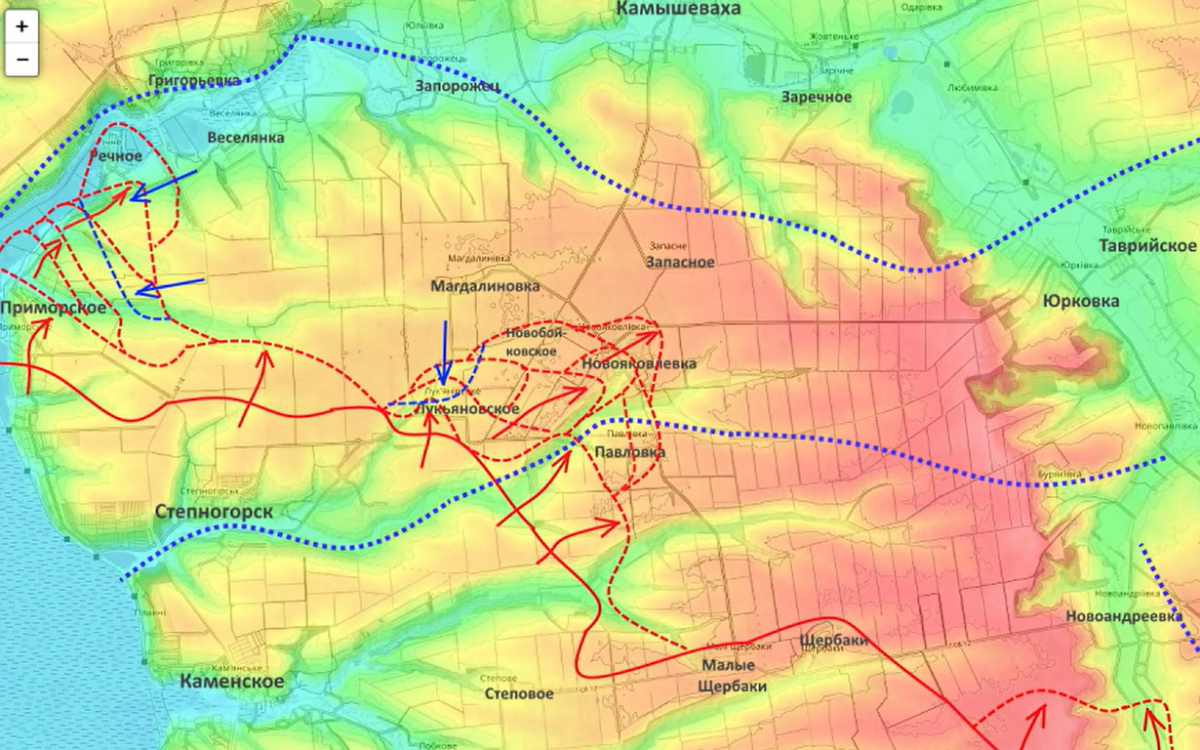 «Мы прорвали главную линию обороны, которую противник возводил на протяжении нескольких лет, которая была у него здесь главной. И опять же, опасность нашего дальнейшего движения на Камышеваху, а также переправа через реку Конка, а там далее уже буквально чуть более 10 км до окраин Запорожья. ВСУ получили команду нанести контрудар. С учётом того, что опереться противник на южном берегу реки Конки мог только на Веселянку и Магдалиновку, именно сюда перегруппировалась часть штурмовых полков, которые были переброшены с севера, и первый удар, который был нанесён, — по Лукьяновскому, в основание нашего выступа», — отметил блогер.