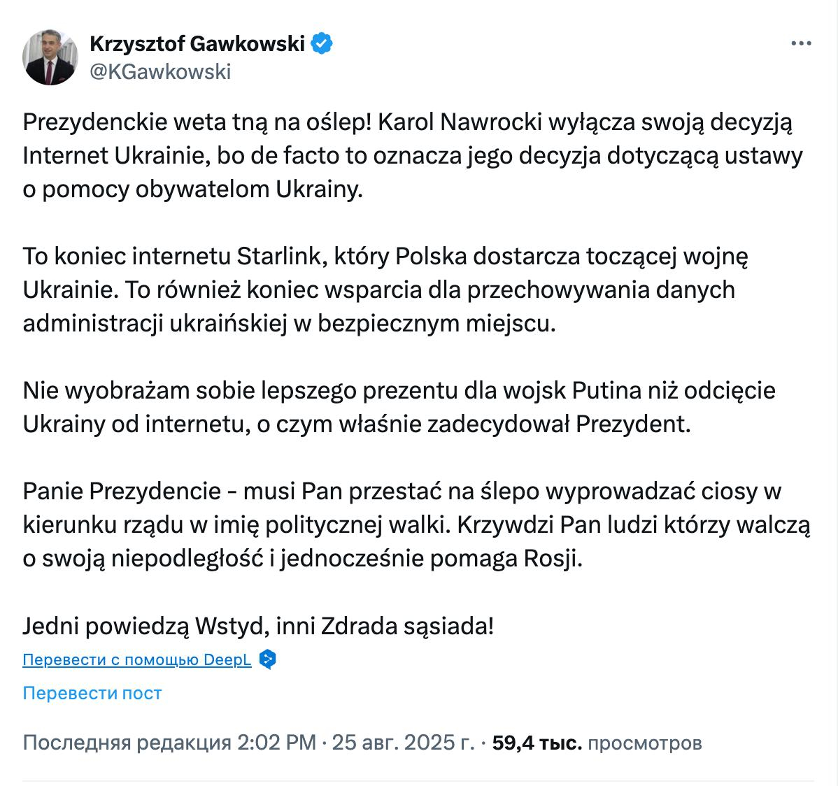 «Кароль Навроцкий своим решением отключает Интернет в Украине, потому что де-факто это означает его решение относительно закона о помощи гражданам Украины. Это конец Интернета Starlink, который Польша предоставляет Украине. Я не могу представить лучшего подарка для армии Путина, чем отключение Украины от Интернета», – отметил Гавковский в Х.