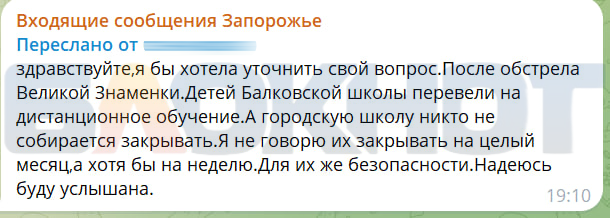 «После обстрела Великой Знаменки детей Балковской школы перевели на дистанционное обучение. А городскую школу никто не собирается закрывать. Я не говорю их закрывать на целый месяц, а хотя бы на неделю. Для их же безопасности», — написала наша читательница.