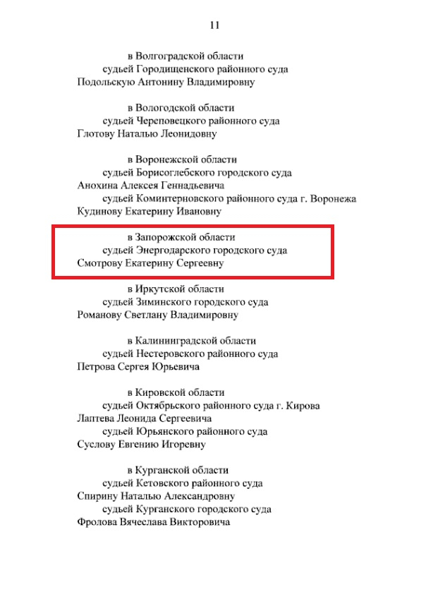 В частности, речь идет о заместителе председателя Запорожского областного суда Алексее Стеклиеве и судье Энергодарского городского суда Запорожской области Екатерине Смотровой.