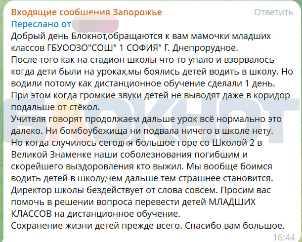 В чат-бот «Блокнот Запорожье» поступило несколько сообщений от родителей учеников ГБУ ОО ЗО «СОШ №1 «София» в Днепрорудном Запорожской области. После трагедии, произошедшей в общеобразовательной школе №2 в Великой Знаменке, они просят принять меры по защите их детей.