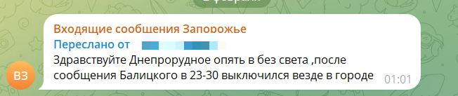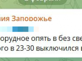 «Днепрорудное опять без света, после сообщения Балицкого в 23-30 выключился везде в городе», – отметили подписчики нашего издания.