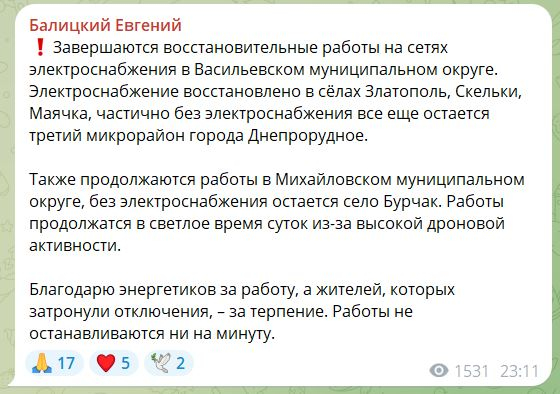 «Частично без электроснабжения все еще остается третий микрорайон города Днепрорудное», – отметил глава региона в 23:11.