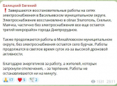 Евгений Балицкий в ночь на 2 февраля сообщил о том, что в Васильевском округе аварийщики заканчивают ремонт сетей электроснабжения. Свет появился в сёлах Златополь, Скельки, Маячка.