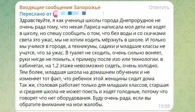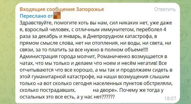 «Уже даже я, взрослый человек, с отличным иммунитетом, переболел четыре раза за декабрь и январь. В Днепрорудном катастрофа, в прямом смысле слова, нет ни отопления, ни воды, ни света, ни связи, зато платить за все нужно в полном объеме! Администрация города молчит, Романиченко возмущается в чатах, что мы только и делаем, что ноем и несём негатив! Все отчитываются, что все хорошо, а мы так и продолжаем сидеть в этой гуманитарной катастрофе. На наши возмущения слышим только: «А вот сколько сегодня населенных пунктов обстреляли, сколько пострадавших, СВО на дворе». Почему же тогда у остальных это все есть, а у нас нет?», — рассказал другой наш читатель.