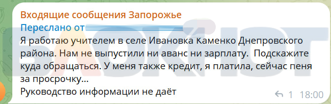 «Я работаю учителем в селе Ивановка Каменско-Днепровского района. Нам не выпустили ни аванс ни зарплату. Подскажите, куда обращаться. У меня также кредит, я платила, сейчас пеня за просрочку... Руководство информации не дает», — написала она.