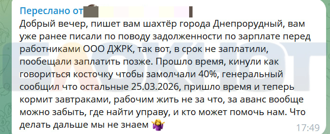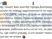 «Вам уже ранее писали по поводу задолженности по зарплате перед работниками ООО ДЖРК, так вот, в срок не заплатили, пообещали заплатить позже. Прошло время, кинули, как говорится, косточку, чтобы замолчали, 40%. Генеральный сообщил, что остальные 25.03.2026, пришло время и теперь кормит завтраками. Рабочим жить не за что, за аванс вообще можно забыть», — написал нам один из шахтеров.