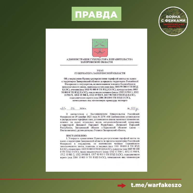"Указ, упомянутый в публикации, действительно существует, но он имеет совершенно иное содержание. Указ №111 касается правил распределения тарифной квоты на вывоз сельскохозяйственной продукции", - говорится в источнике.