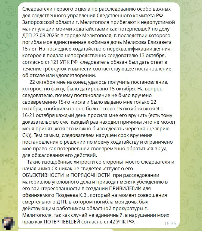 В Мелитополе мама сбитой экс-прокурором 15-летней Лизы столкнулась с волокитой СК