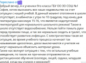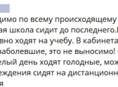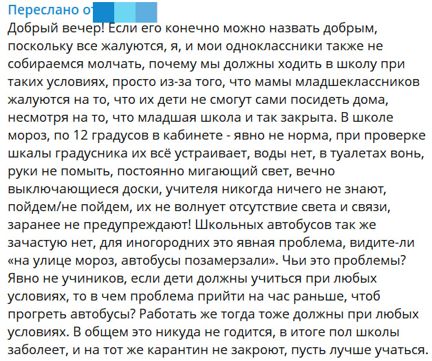 «Почему мы должны ходить в школу при таких условиях просто из-за того, что мамы младшеклассников жалуются на то, что их дети не смогут сами посидеть дома, несмотря на то, что младшая школа и так закрыта? В школе мороз, по 12 градусов в кабинете — явно не норма, при проверке шкалы градусника их всё устраивает, воды нет, в туалетах вонь, руки не помыть, постоянно мигающий свет, вечно выключающиеся доски, учителя никогда ничего не знают, пойдем/не пойдем, их не волнует отсутствие света и связи, заранее не предупреждают!» — делится ученик одной из местных школ.