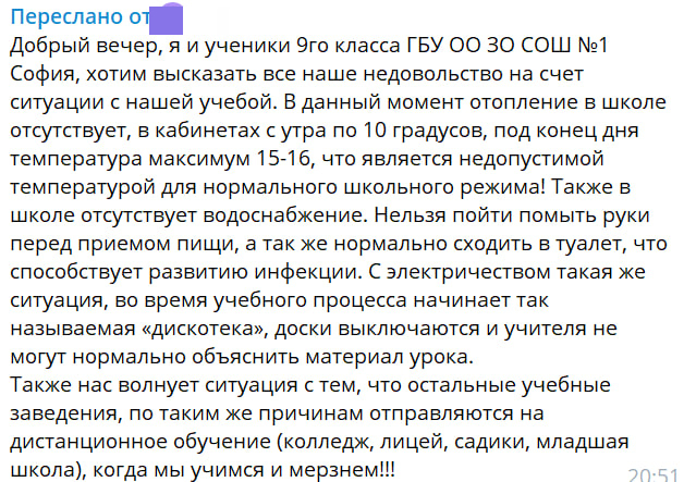 «Я и ученики 9-го класса ГБУ ОО ЗО СОШ №1 «София» хотим высказать все наше недовольство насчет ситуации с нашей учебой. В данный момент отопление в школе отсутствует, в кабинетах с утра по 10 градусов, под конец дня температура максимум 15-16, что является недопустимой температурой для нормального школьного режима! Также в школе отсутствует водоснабжение. Нельзя пойти помыть руки перед приемом пищи, а также нормально сходить в туалет, что способствует развитию инфекции. С электричеством такая же ситуация, во время учебного процесса начинает так называемая «дискотека», доски выключаются и учителя не могут нормально объяснить материал урока», — написал еще один житель Днепропрудного.