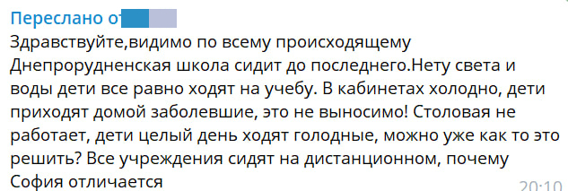 «Видимо по всему происходящему, Днепрорудненская школа сидит до последнего. Нету света и воды, дети все равно ходят на учебу. В кабинетах холодно, дети приходят домой заболевшие, это невыносимо! Столовая не работает, дети целый день ходят голодные, можно уже как-то это решить? Все учреждения сидят на дистанционном, почему «София» отличается?» — возмущается еще один читатель «Блокнота».