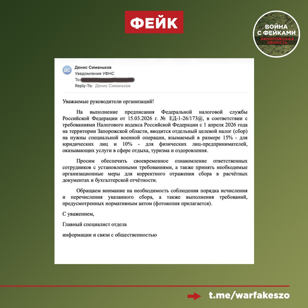 Ранее в фейковом канале губернатора Запорожской области и ряде других телеграм-каналов, маскирующихся под пророссийские, появилась информация о том, что якобы региональные предприятия сферы отдыха и оздоровления обязали передавать 15% дохода на нужды СВО. Телеграм-канал «Война с фейками. Запорожская область», который ведут местные власти, опроверг эти данные.