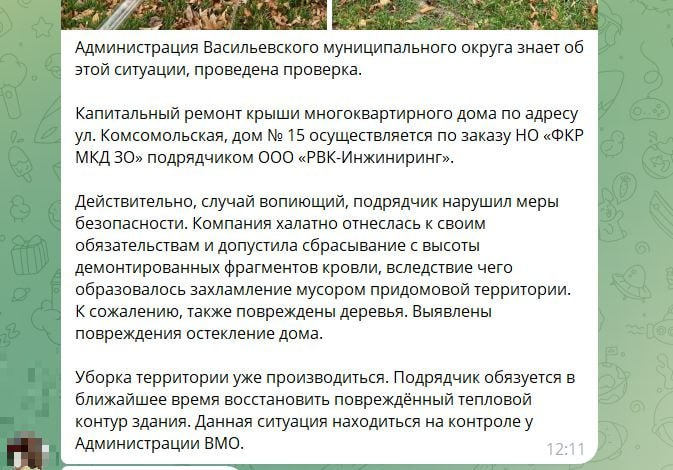 "Действительно, случай вопиющий, подрядчик нарушил меры безопасности. Компания халатно отнеслась к своим обязательствам и допустила сбрасывание с высоты демонтированных фрагментов кровли, вследствие чего образовалось захламление мусором придомовой территории. К сожалению, также повреждены деревья. Выявлены повреждения остекление дома", - говорится в официальном комментарии чиновников.