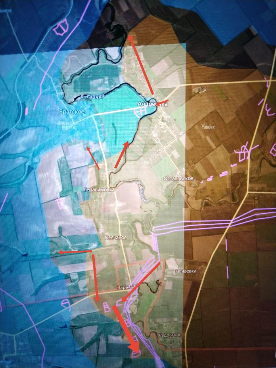 «Этот плацдарм удалось расширить по фронту до 6 км, что обеспечило фланг/тыл наших подразделений, атакующих Братское, и повысило угрозу прорыва наших штурмовых групп в н.п. Терноватое с востока и северо-восточнее», — написал Котенок.