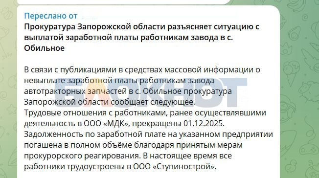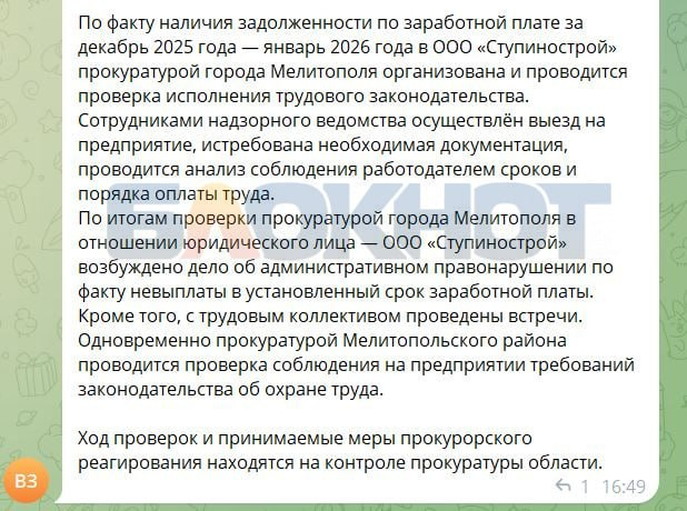 «По факту наличия задолженности по заработной плате за декабрь 2025 года — январь 2026 года в ООО «Ступинострой» прокуратурой города Мелитополя организована и проводится проверка исполнения трудового законодательства. Сотрудниками надзорного ведомства осуществлён выезд на предприятие, истребована необходимая документация, проводится анализ соблюдения работодателем сроков и порядка оплаты труда», — сообщили в надзорном органе.