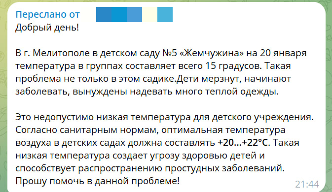 «В Мелитополе в детском саду №5 «Жемчужина» на 20 января температура в группах составляет всего 15 градусов. Такая проблема не только в этом садике. Дети мерзнут, начинают заболевать, вынуждены надевать много теплой одежды», — отметила женщина.