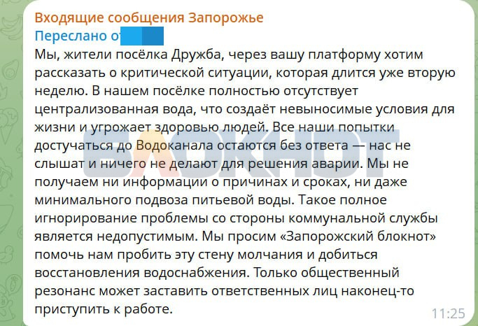 «Нас не слышат и ничего не делают для решения аварии. Мы не получаем ни информации о причинах и сроках, ни даже минимального подвоза питьевой воды. Такое полное игнорирование проблемы со стороны коммунальной службы является недопустимым», — говорится в сообщении.