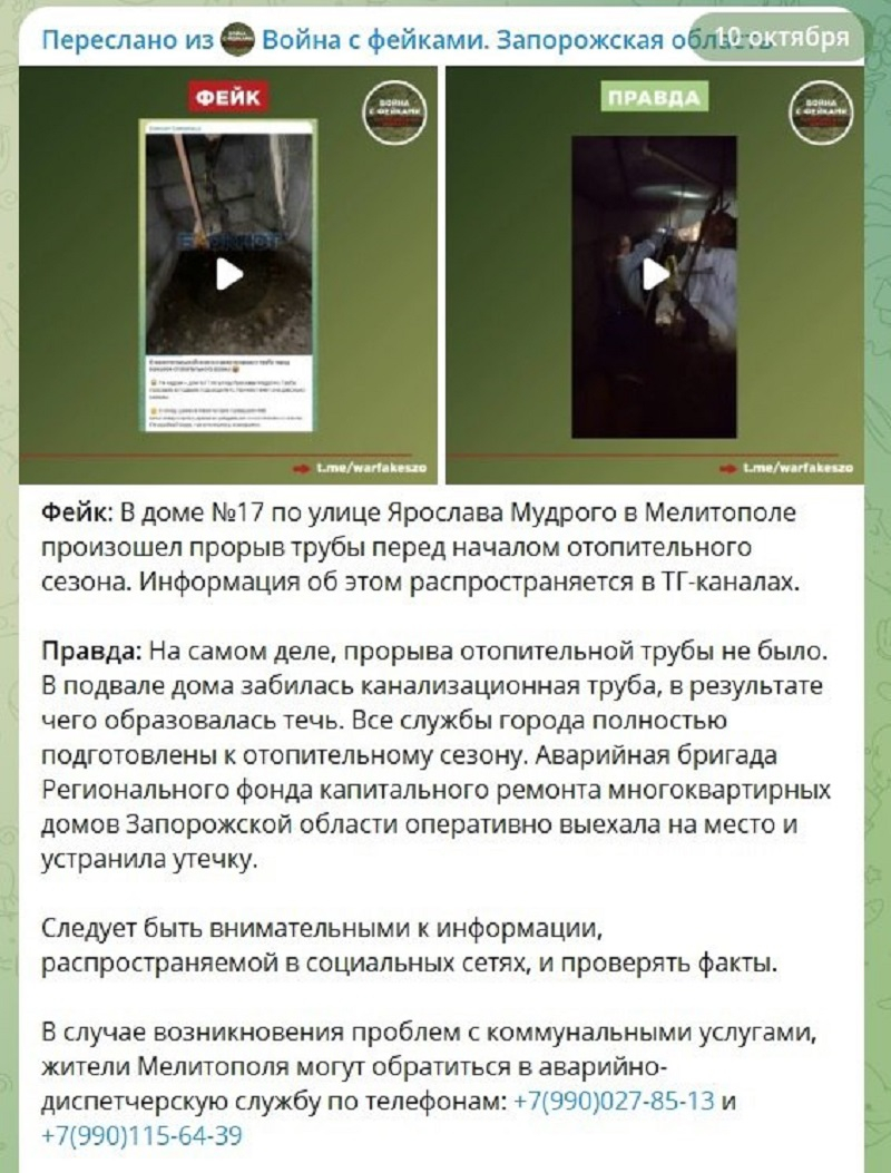 Тем не менее, местные чиновники, а именно они ведут канал «Война с фейками. Запорожская область», поспешили обвинить нас в публикации фейка.