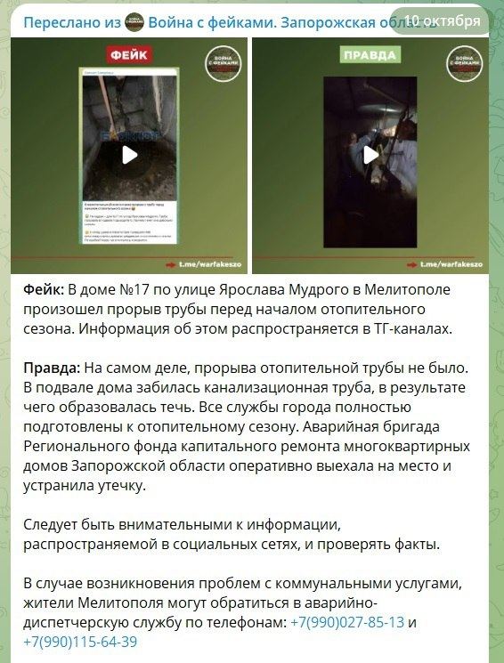 Исходя из этого, мы предложили авторам канала «Война с фейками» поменять заголовок уже в их посте на «Фейковые новости помогают делать жизнь мелитопольцев лучше». А коммунальщиков мы поблагодарили за их труд, которые действительно достаточно оперативно устранили поломку.
