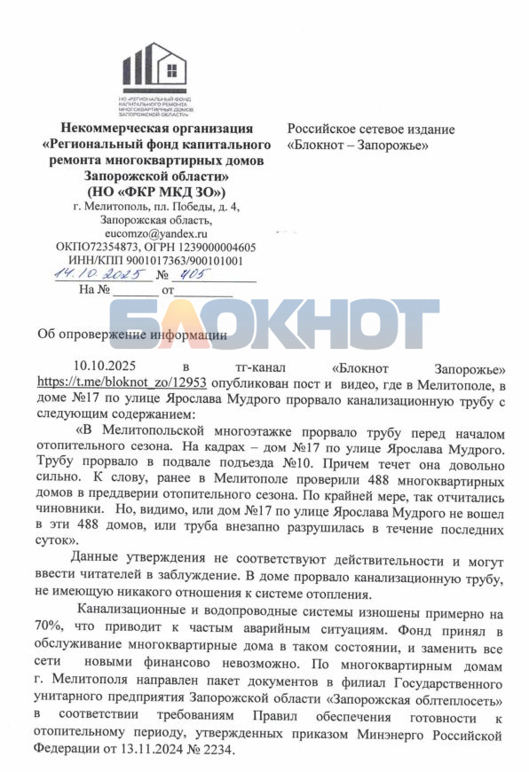 14 октября Запорожский Фонд капремонта потребовал от нас опровергнуть сведения, которые мы публиковали вокруг этой истории с порывом в трубе подвала дома №17 на улице Ярослава Мудрого в Мелитополе. Такое письмо пришло к нам на почту.
